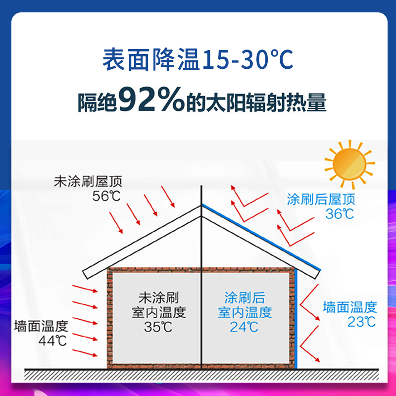 水性、單組分、乳白色、集反射、輻射、紅外線屏蔽與納米空心微珠隔熱合成、陽光熱反射率90%、降溫涂料。