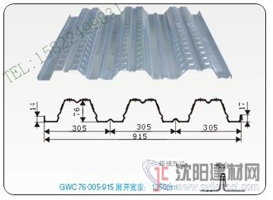 YX76-305-915是樓承板一種型號又稱為3W樓承板,表示為壓型板波高為76MM,波距為305mm,有效寬度915mm,三個波。是用1250MM寬度的鍍鋅板壓型而成.可壓型厚度為0.7-1.5毫米